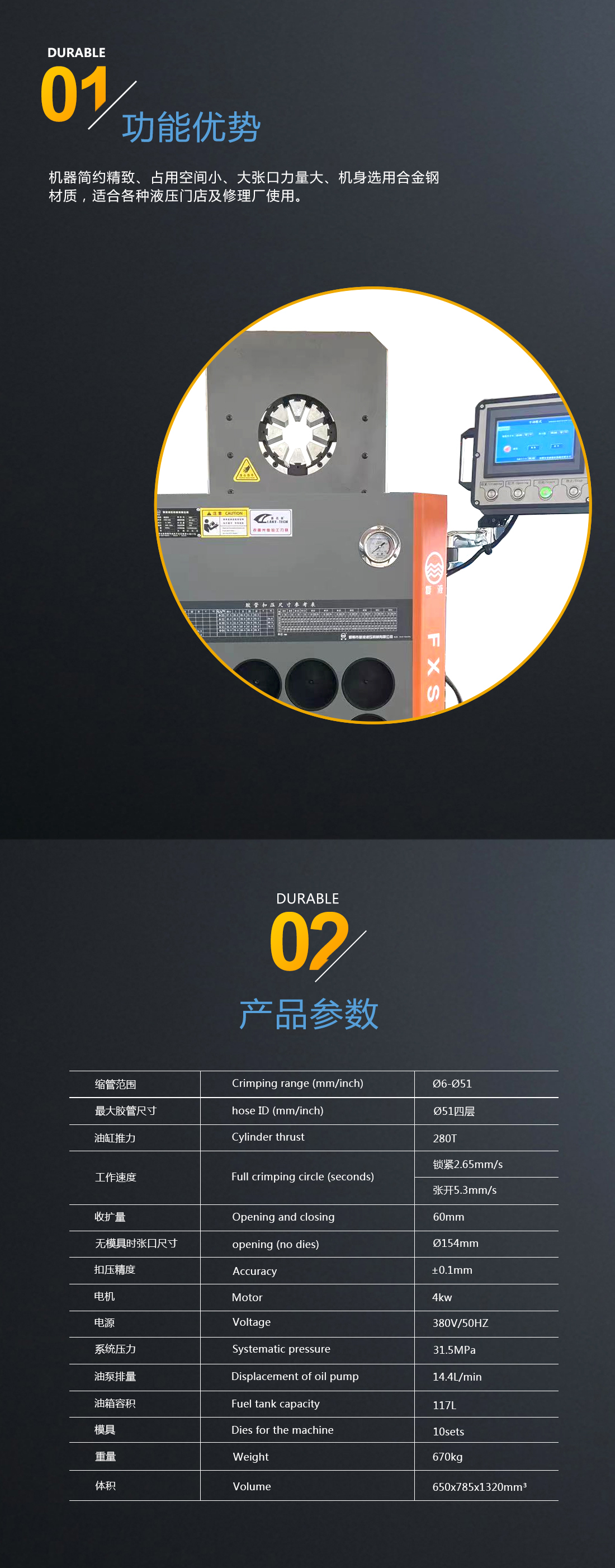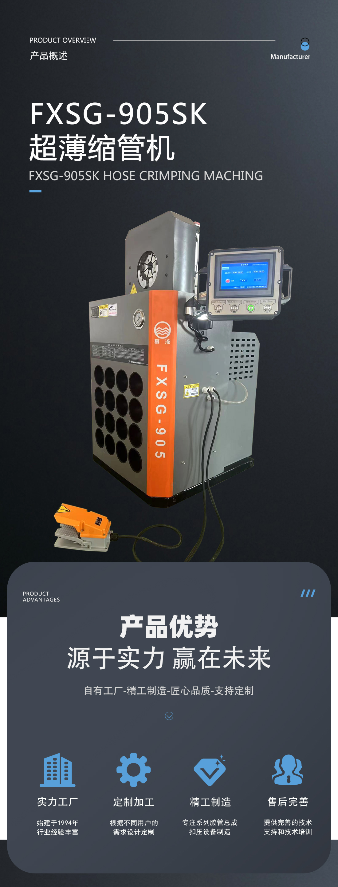 我公司新研發(fā)成功了超薄系列縮管機(jī),扣壓重復(fù)精度可達(dá)到0.1mm。超薄的結(jié)構(gòu)形式克服了傳統(tǒng)環(huán)形扣壓機(jī)固有的不足,能夠非常方便的扣壓形狀復(fù)雜的高壓油管總成和異型軟軸軟管。此款機(jī)器外觀尺寸更小,采用人性化設(shè)計(jì),更方便使用者操作??刂葡到y(tǒng)采用的是PLC+觸摸屏模式,位移傳感器采集信號(hào)精度高,系統(tǒng)可采用手動(dòng)、半自動(dòng)和全自動(dòng)三種模式,用戶可根據(jù)實(shí)際加工的工況非常方便的進(jìn)行選擇,從而大大提高加工效率。在您使用的過(guò)程中如遇到有不方便之處請(qǐng)及時(shí)與我們聯(lián)系,我們將以不懈的努力提高您的產(chǎn)品質(zhì)量和工作效率。